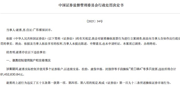 根据证监会披露的信息,经查明,谢勇实际控制并使用多个证券账户,以连续交易、拉抬、虚假申报、封涨停等手段操纵“渝三峡A”等多只股票,违法所得合计8145万元。