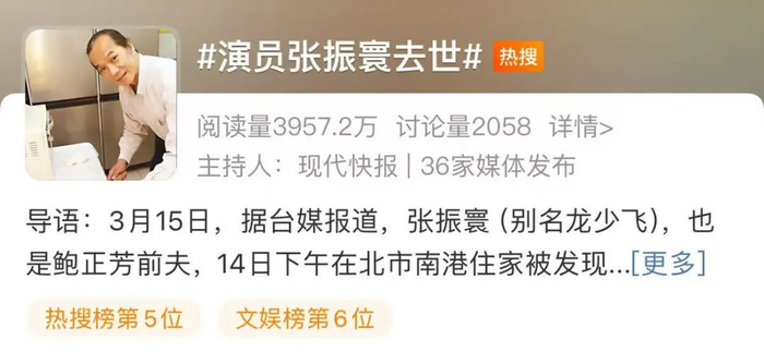 据悉,14日下午4点55分消防队接获张振寰邻居报案,称其家中传出异味,警方抵达他在台北市南港的家中时,发现他已身亡多日,至于死因,南港警方表示,初判无外力介入,死因疑似为病逝,其前妻鲍正芳经纪人亦未回复媒体任何讯息。目前,具体去世原因正在调查当中。