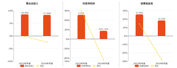 公司营业总收入为117.86亿元,较去年同报告期营业总收入减少3.00亿元,同比较去年同期下降2.49%。归母净利润为7671.74万元,较去年同报告期归母净利润减少1.50亿元,同比较去年同期下降66.16%。经营活动现金净流入为19.73亿元,较去年同报告期经营活动现金净流入减少7.73亿元,同比较去年同期下降28.16%。