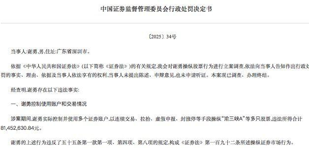 根据证监会披露的信息,经查明,谢勇实际控制并使用多个证券账户,以连续交易、拉抬、虚假申报、封涨停等手段操纵“渝三峡A”等多只股票,违法所得合计8145万元。