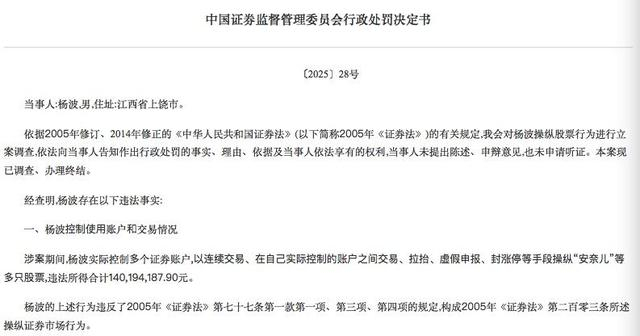 证监会决定,没收杨波违法所得1.4亿元,并处以1.4亿元的罚款。