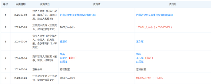 在此之前,伊利股份曾在2023年5月对该公司增资5000万元。
