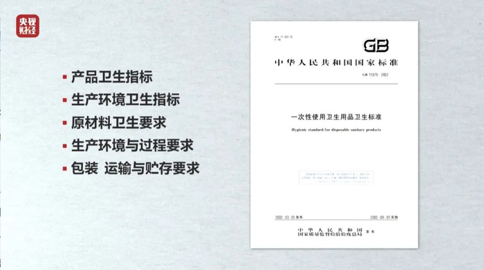 中华人民共和国国家标准GB 15979-2002《一次性使用卫生用品卫生标准》,从产品卫生、生产环境、原材料、生产流程,到包装、运输、贮存等各环节,都制定了详尽规范。