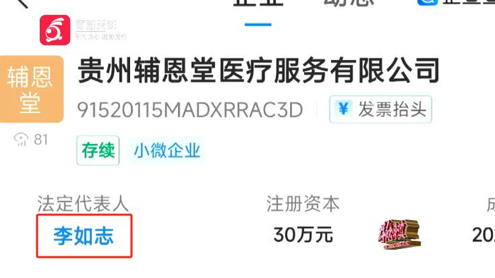 据了解,“生命医疗中心”的公司名称为贵州辅恩堂医疗服务有限公司,李如志正是法定代表人。