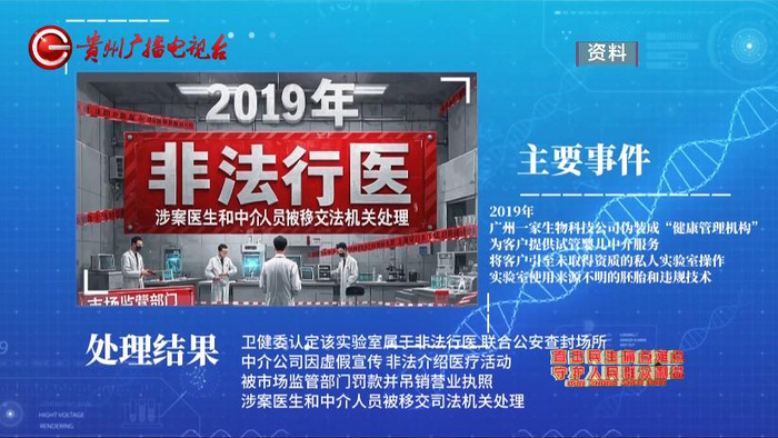2019年,广州一家生物科技公司伪装成“健康管理机构”,为客户提供试管婴儿中介服务,将客户引至未取得资质的私人实验室操作,实验室使用来源不明的胚胎和违规技术。卫健委认定该实验室属于非法行医,联合公安查封场所。中介公司因虚假宣传、非法介绍医疗活动,被市场监管部门罚款并吊销营业执照,涉案医生和中介人员被移交司法机关处理。