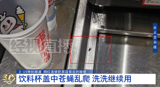 记者多次在店内看到有苍蝇和小飞虫在奶茶杯盖上乱爬,其他店员表示:“这个明天可以接着用,用来盖柠檬和橙子。