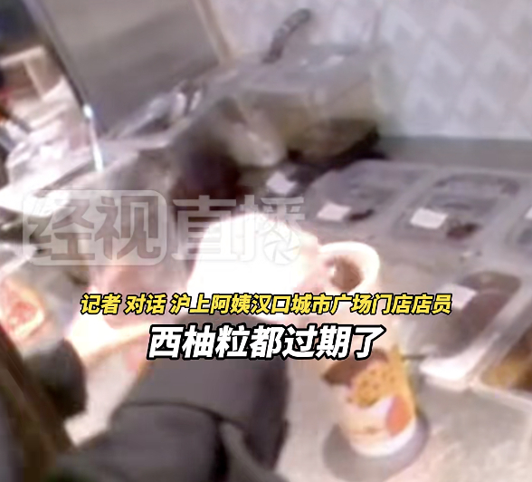 另一家知名茶饮品牌沪上阿姨也被曝光。记者在沪上阿姨汉口城市广场店内看到用来制作杨枝甘露的西柚粒已过期,店员经提醒后只是笑笑,并且重新打印小料保质期,继续用过期材料制作茶饮。