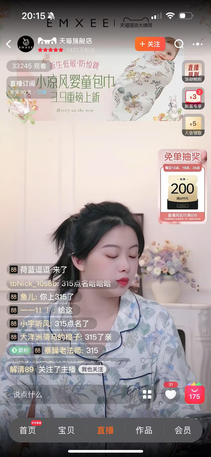 据时代财经了解,上述品牌中,嫚熙的天猫直播间在315晚会开播时原本在直播,随着被曝流出次品,网友涌入直播间留言,目前嫚熙直播间已紧急停播。根据嫚熙官方店产品页,315被曝流出次品的嫚熙拉拉裤产品,门店售价为99.9元一包。一包的规格根据产品尺码不同,在20片~52片之间不等。