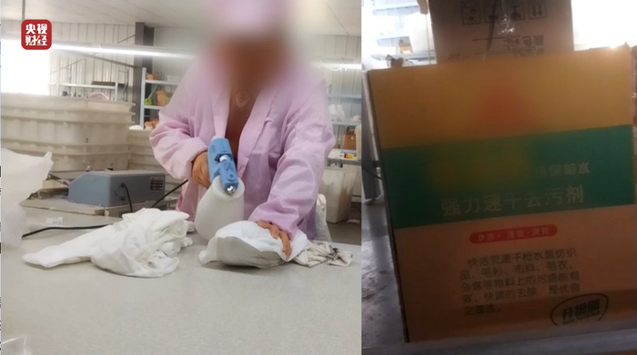 企业的工作人员告诉记者,他们喷在一次性内裤上的液体,其实是一种强力速干去污剂。气味不好闻,也不能直接用手去触摸。