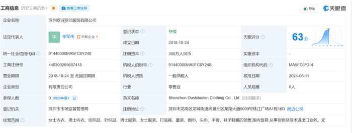 央视3·15晚会曝光一次性内裤徒手制作不灭菌问题,欧诗罗兰被点名。天眼查App显示,深圳欧诗罗兰服饰有限公司成立于2018年10月,法定代表人为李军伟,注册资本300万人民币,经营范围包括女士内衣、男士内衣、纺织品、针织品、男士服装、女士服装、打底裤,童装、围巾、头巾、手套、袜子鞋帽的销售等,由李军伟、李美霞共同持股。知识产权信息显示,该公司已申请三角收腹裤、平角收腹裤、U型收腹衣等专利。年报信息显示,该公司2023年参保人数为0。