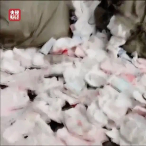 从画面上看,其仓库中除了打成整包的垃圾,还有很多卫生巾、纸尿裤散落在地上,脏乱不堪。几百平方米的仓库一大半空间被这些生产垃圾占用,记者粗略计算,目测现场至少有上百吨货。所谓的“好东西”就是生产垃圾中,相对完好的婴儿纸尿裤和卫生巾的残次品,这样的货他们业内称之为“二等品”。