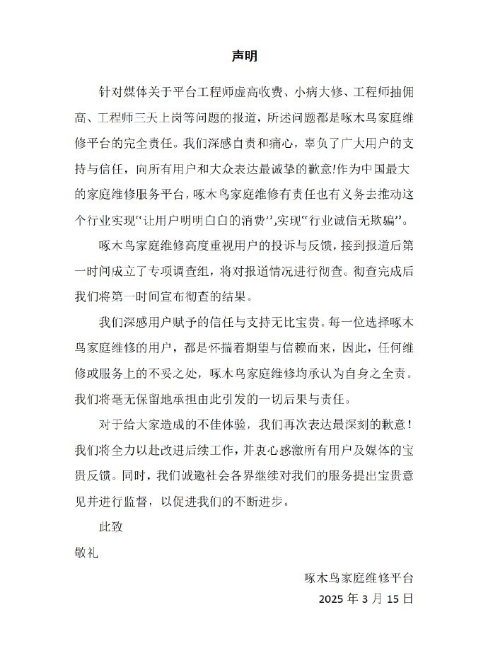 啄木鸟家庭维修致歉