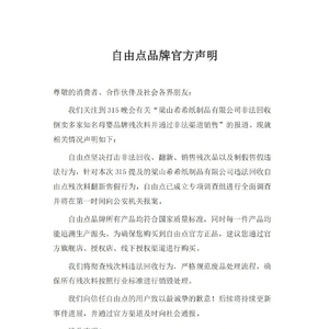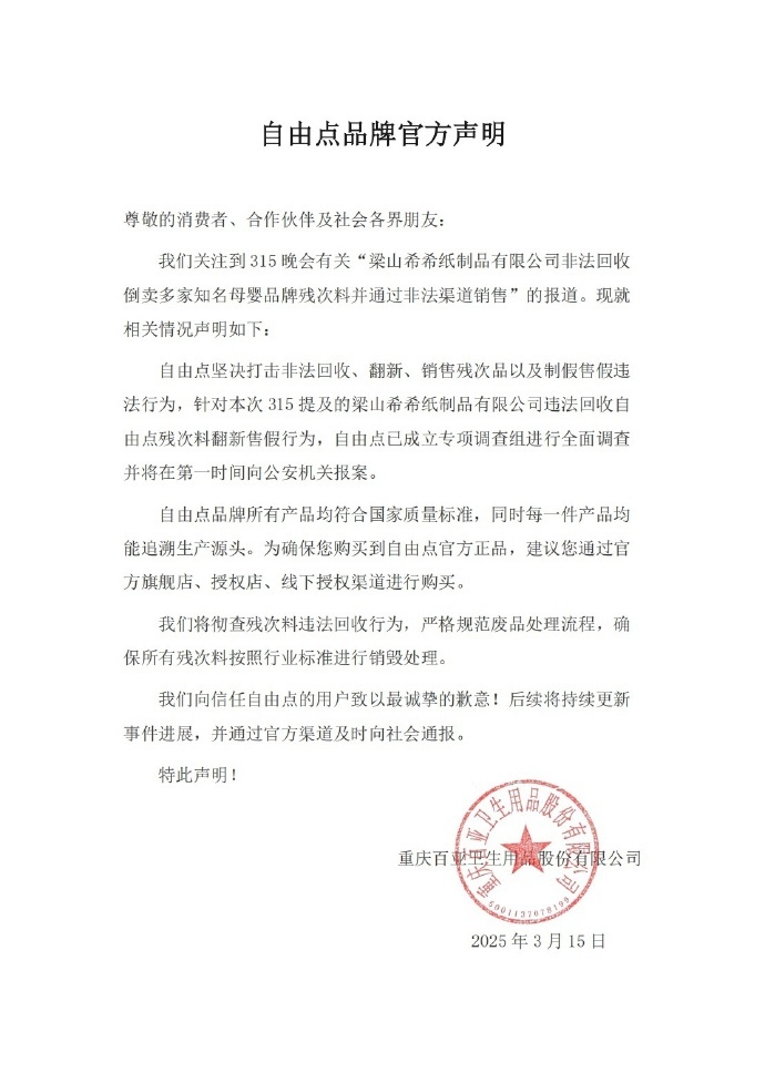 自由点3月15日晚发布声明称,自由点坚决打击非法回收、翻新、销售残次品以及制假售假违法行为,针对本次315提及的梁山希希纸制品有限公司违法回收自由点残次料翻新售假行为,自由点已成立专项调查组进行全面调查并将在第一时间向公安机关报案。