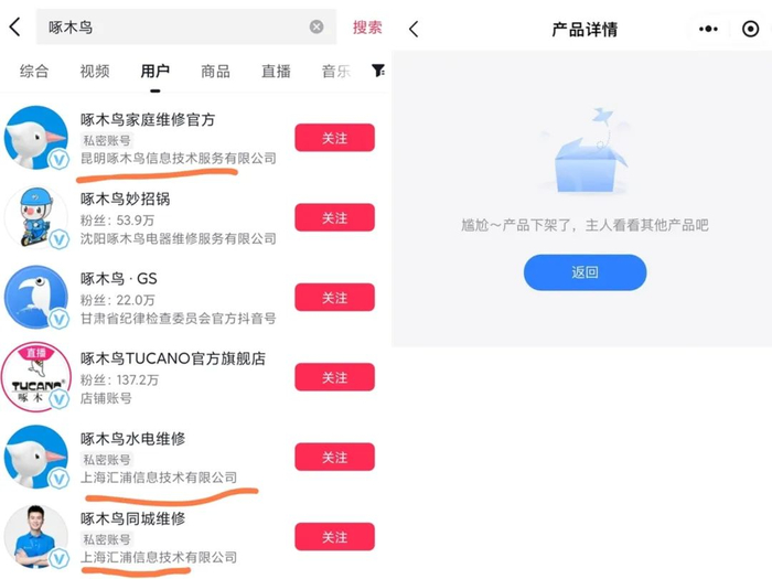 网友还发现,啄木鸟家电维修专区已下架,并且多个已认证的啄木鸟相关账号设置为私密账号。