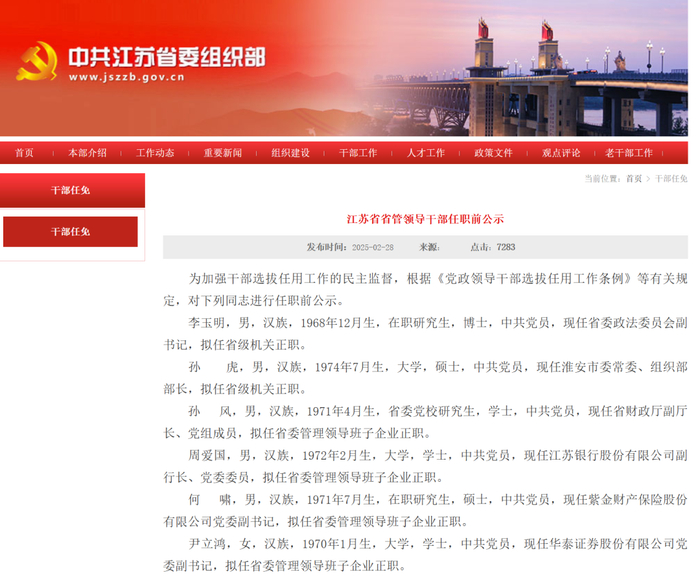 职业动向:根据2025年2月28日江苏省委组织部公示,尹立鸿拟任省委管理领导班子企业正职,此次调动属政府人事安排。