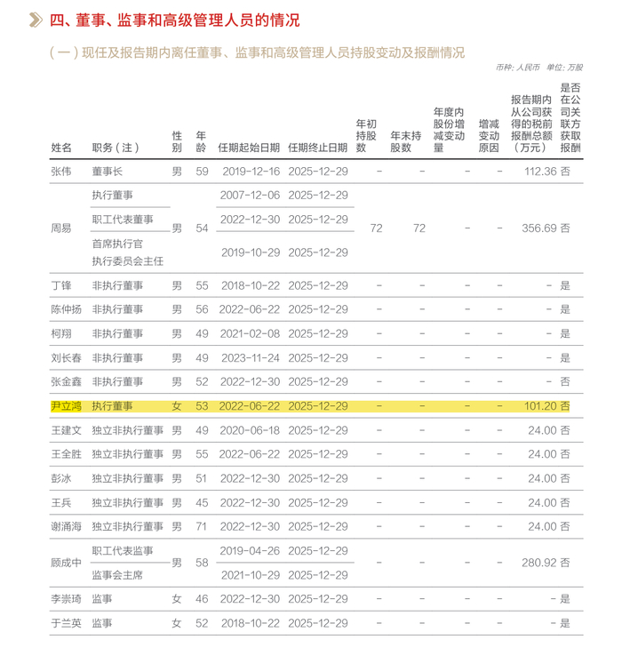 尹立鸿女士,1970年1月出生,本科,国民经济管理专业,高级经济师。1991年8月至2007年8月在中国银行南京市分行、中国银行江苏省分行工作;2007年9月至2021年6月在江苏银行工作,先后担任计划财务部总经理助理、人力资源部副总经理、人力资源部总经理兼党委组织部部长;2021年6月进入华泰证券工作,2021年6月至2022年6月任华泰证券股份有限公司党委副书记,2022年6月至今任华泰证券股份有限公司党委副书记、董事,本届董事会任期为2022年12月至2025年12月。