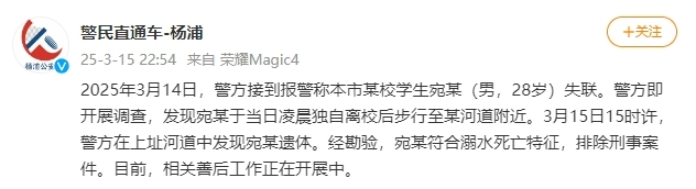 新京报讯 据@警民直通车-杨浦微博消息,2025年3月14日,警方接到报警称本市某校学生宛某(男,28岁)失联。警方即开展调查,发现宛某于当日凌晨独自离校后步行至某河道附近。3月15日15时许,警方在上址河道中发现宛某遗体。经勘验,宛某符合溺水死亡特征,排除刑事案件。目前,相关善后工作正在开展中。