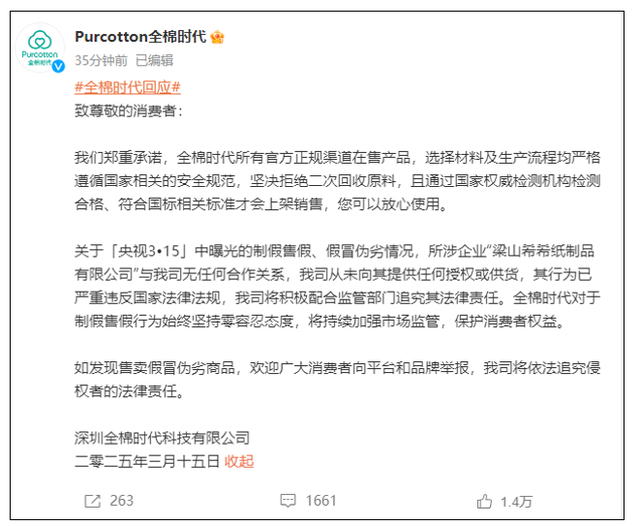 我们郑重承诺,全棉时代所有官方正规渠道在售产品,选择材料及生产流程均严格遵循国家相关的安全规范,坚决拒绝二次回收原料,且通过国家权威检测机构检测合格、符合国标相关标准才会上架销售,您可以放心使用。关于「央视3•15」中曝光的制假售假、假冒伪劣情况,所涉企业“梁山希希纸制品有限公司”与我司无任何合作关系,我司从未向其提供任何授权或供货,其行为已严重违反国家法律法规,我司将积极配合监管部门追究其法律责任。全棉时代对于制假售假行为始终坚持零容忍态度,将持续加强市场监管,保护消费者权益。
