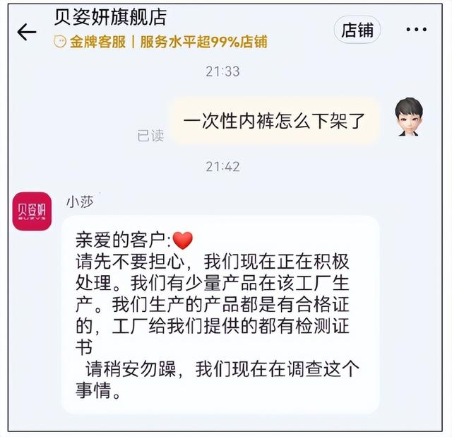 另据@国是直通车,浪莎官方旗舰店能搜索到三款一次性内裤产品,均显示下架,其中有产品还特意宣称孕妇可用。对于下架原因的询问,客服已读不回。