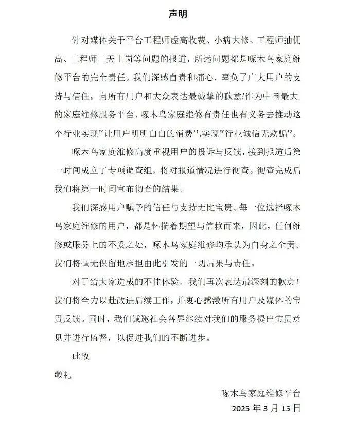 最新消息显示,啄木鸟家庭维修官方微博道歉,称已成立专项调查组,将对报道情况进行彻查。彻查完成后,第一时间宣布彻查结果。