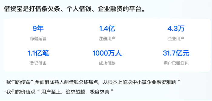 其中,借贷宝是一款专业提供电子借条、欠条模板、借款合同和企业融资服务的软件。官网显示,其注册用户数已达1.4亿人,登记借条1.1亿笔。