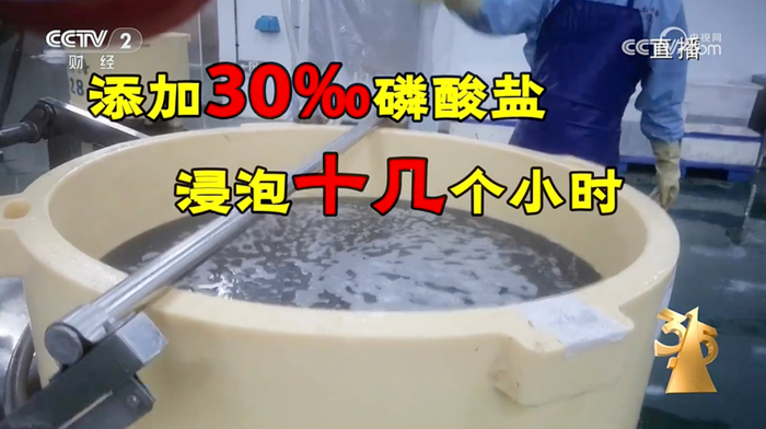 记者在走访中了解到,国家对冷冻水产品中磷酸盐的添加量有着极为严格的规定,但多家企业“会根据客户需求,定制不同规格的虾仁”,例如,一家企业的虾仁磷酸盐添加量达到千分之三十,浸泡时间长达十几个小时,保水率高达百分之二十,这会导致虾仁磷酸盐含量严重超标,企业负责人却对此并不在意。毕竟水比货压秤,添多少,就能多出多少重量。