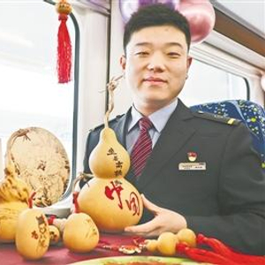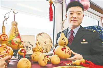 列车工作人员向乘客介绍烙画非遗文化