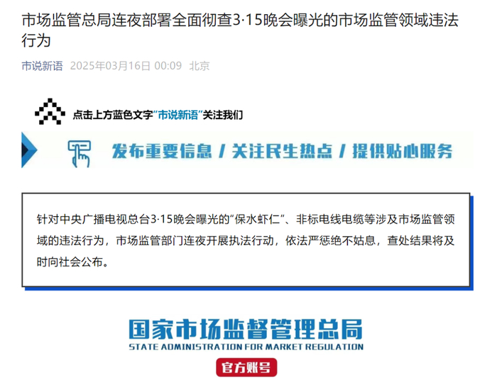 针对中央广播电视总台3·15晚会曝光的“保水虾仁”、非标电线电缆等涉及市场监管领域的违法行为,市场监管部门连夜开展执法行动,依法严惩绝不姑息,查处结果将及时向社会公布。