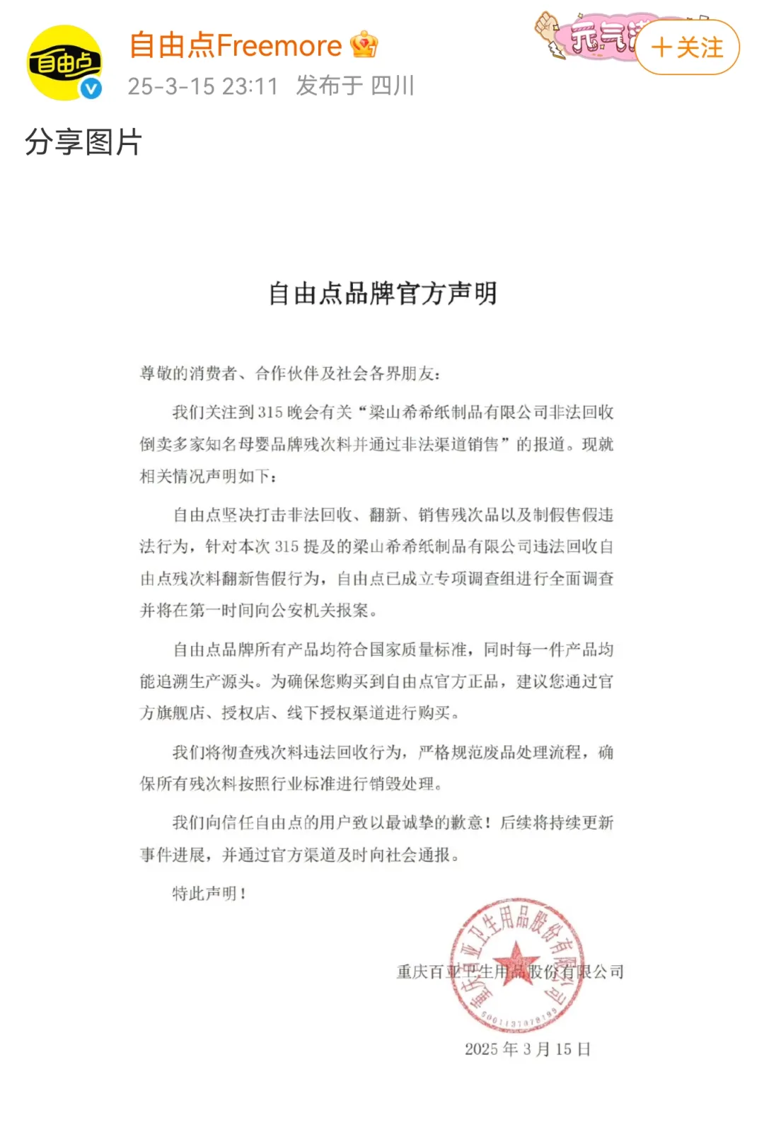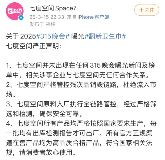 3月15日晚,护舒宝和七度空间、苏菲、自由点发布声明进行回应。