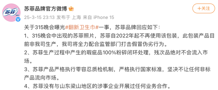 苏菲回应,315晚会中出现的苏菲照片,苏菲自2022年起不再使用该包装,此包装产品目前非该司生产,将全力配合监管部门打击假冒伪劣行为。苏菲表示,生产过程中产生的瑕疵品100%粉碎闭环处理,残次品绝对不会流入市场。