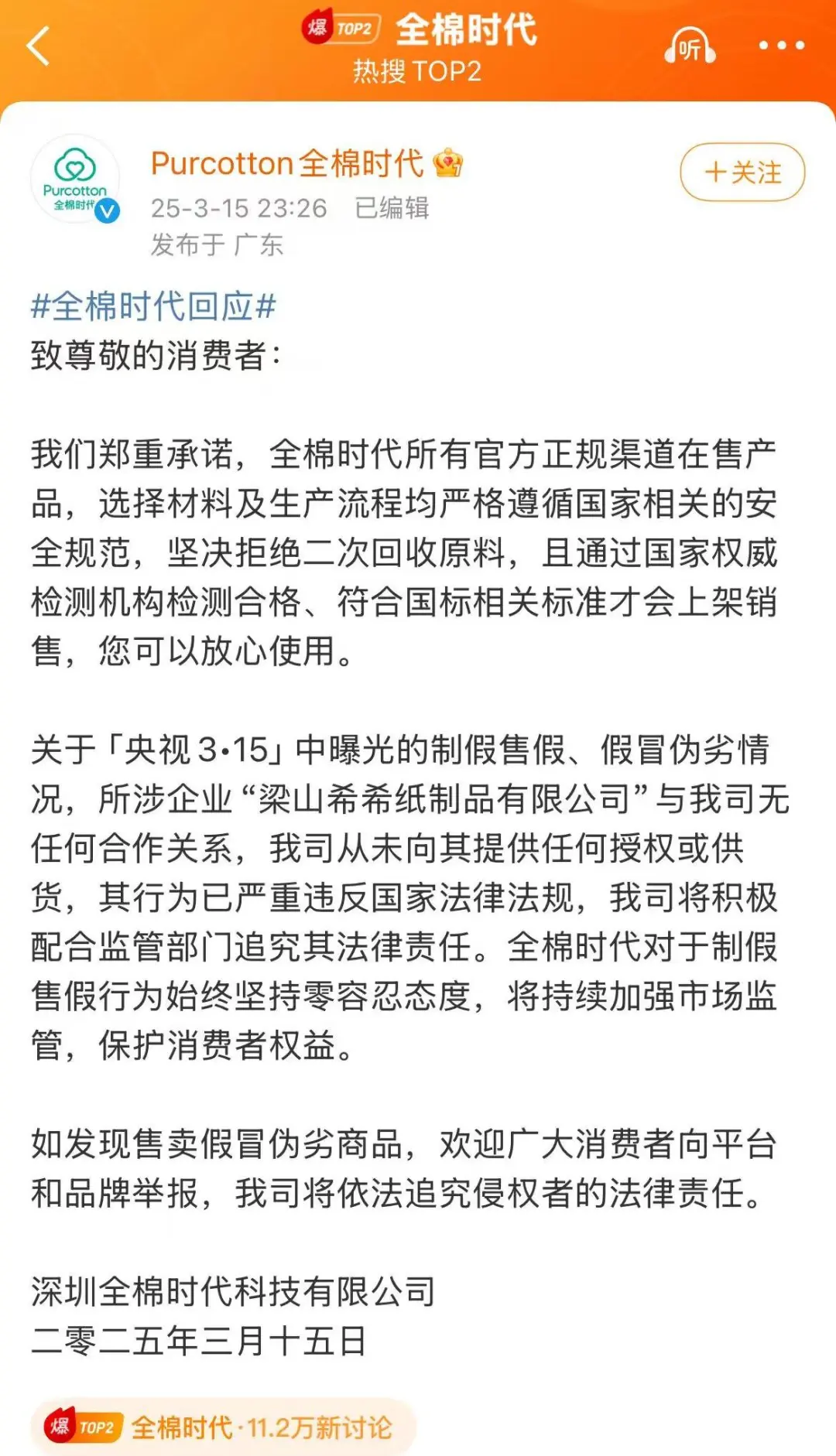 全棉时代回应,与涉事企业无任何合作关系。全文如下↓