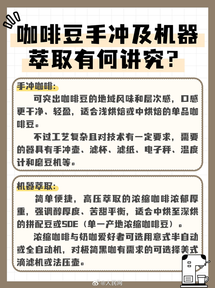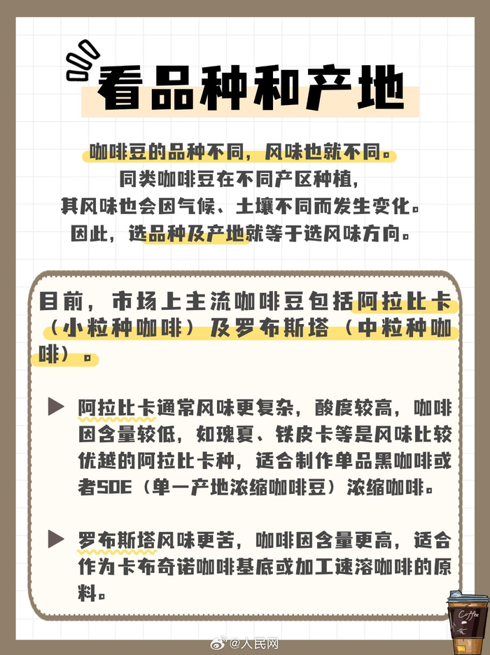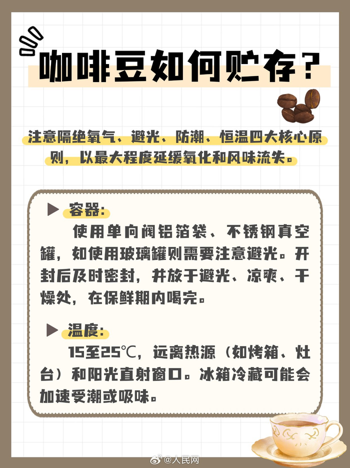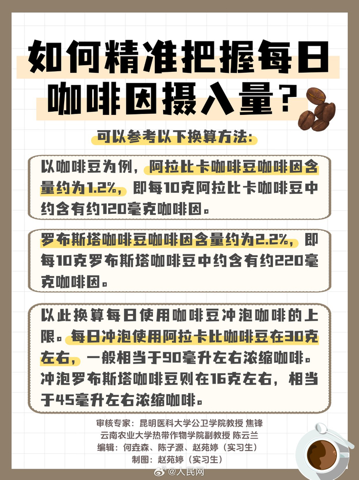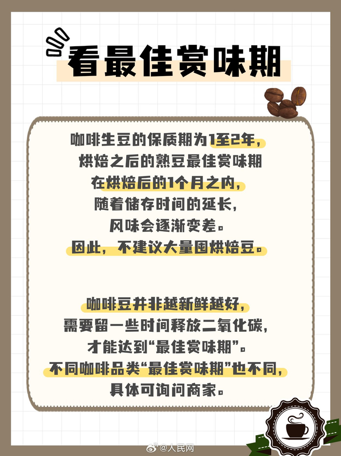 建议每日摄入咖啡因不超过400毫克随着国内咖啡消费强劲增长,咖啡成为了许多消费者购物清单里的必选项。对于部分咖啡爱好者来说,咖啡豆同样必不可少。但市面上的咖啡豆品种丰富,怎么选择适合自己的咖啡豆?怎么看懂咖啡豆产品包装?咖啡豆又有哪些使用注意事项?戳图↓↓(人民网 陈子源)咖啡豆怎么选?看懂包装事半功倍!