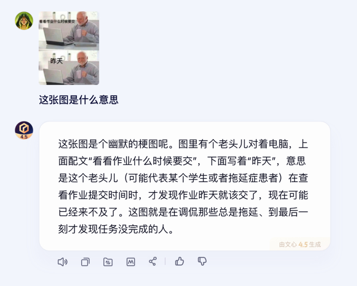 根据「甲子光年」实测,文心4.5在多模态理解方面可圈可点。在图片理解领域,它能够解读日常照片、电影截图、网络梗图以及讽刺漫画等,理解其意义和用途。