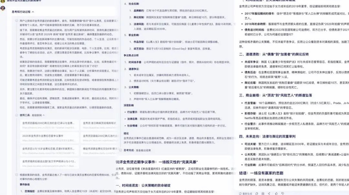 文本创作方面,文心X1更擅长撰写 “锐评”,相比4.0版本观点更鲜明,态度更尖锐。比如要求它“锐评”近期韩国演员金秀贤所涉新闻事件时,文心X1的分析角度非常全面,在事业脉络,争议焦点,深层影响几个维度下又拆分出若干要点。