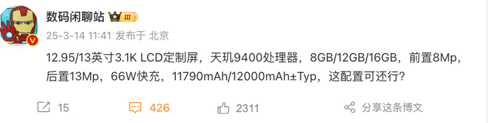 据爆料达人数码闲聊站暗示,疑似vivo Pad4 Pro的新平板将采用12.95/13英寸3.1K LCD定制屏,天玑9400处理器,提供8GB/12GB/16GB三种内存规格可选,前置8MP,后置13MP,12000mAh左右电池,66W有线充电。预计这款平板将和vivo X200S和X200 Ultra同期在4月发布。