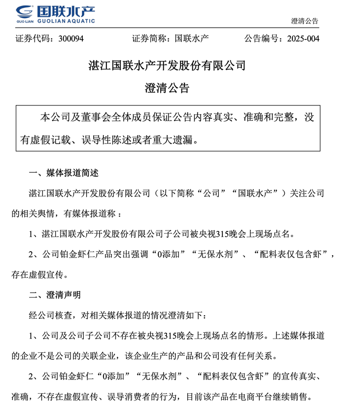 经公司核查,对相关媒体报道的情况澄清如下:1、公司及公司子公司不存在被央视315晚会上现场点名的情形。上述媒体报道的企业不是公司的关联企业,该企业生产的产品和公司没有任何关系。 2、公司铂金虾仁“0添加”“无保水剂”、“配料表仅包含虾”的宣传真实、准确,不存在虚假宣传、误导消费者的行为,目前该产品在电商平台继续销售。