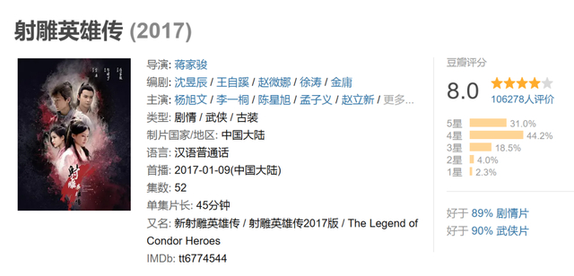 这些年,好一些的翻拍剧也有,比如电影《误杀》等等。2017版《射雕英雄传》被评价忠于原著,豆瓣评分达到了8分,观众比较认可。