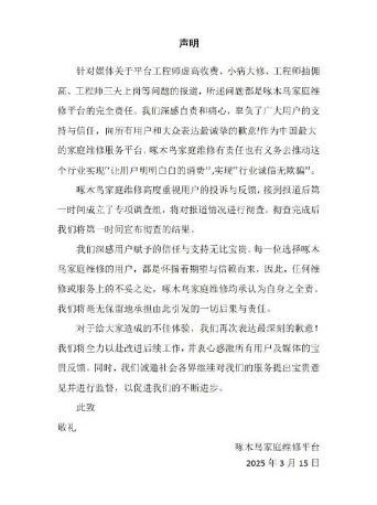 随后,啄木鸟家庭维修发布声明称,针对媒体关于平台工程师虚高收费、小病大修、工程师抽佣高、工程师三天上岗等问题的报道,所述问题都是啄木鸟家庭维修平台的完全责任,公司深感自责和痛心。接到报道后第一时间成立了专项调查组,将对报道情况进行彻查。彻查完成后将宣布彻查的结果。