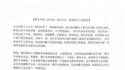 啄木鸟再回应被3·15晚会点名称,全体管理层决定:放弃公关。声明称,这件事没有公关可做,没有任何解释可以让一切回到过去。公司将每天发布一条整改声明,每天公开一项整改进展,直到所有问题被彻底解决。