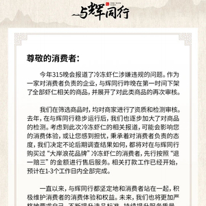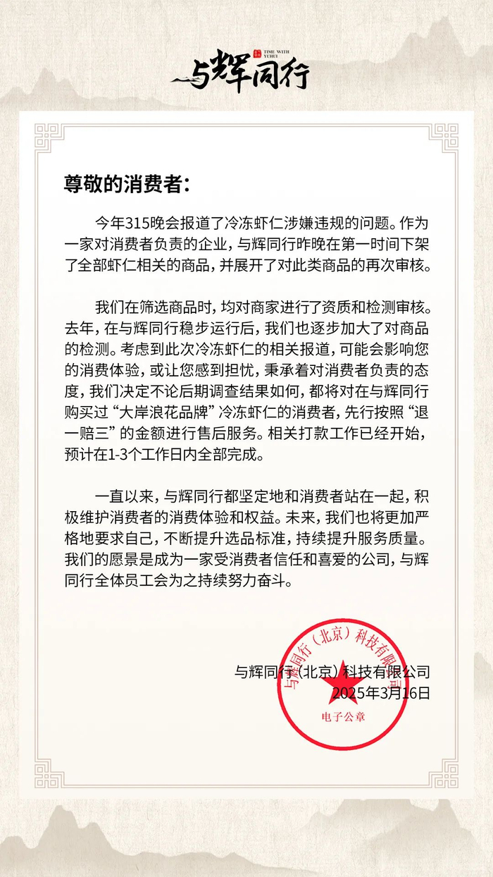 3月16日,@与辉同行发布声明:今年315晚会报道了冷冻虾仁涉嫌违规的问题。作为一家对消费者负责的企业,与辉同行昨晚在第一时间下架了全部虾仁相关的商品,并展开了对此类商品的再次审核。声明表示,不论后期调查结果如何,与辉同行将对购买过“大岸浪花品牌”冷冻虾仁的消费者,先行按照“退一赔三”的金额进行售后服务。相关打款工作已经开始,预计在1-3个工作日内全部完成。