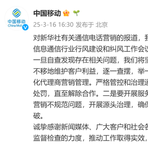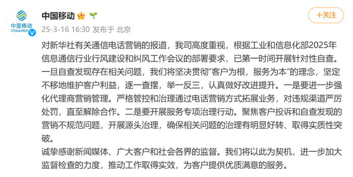 对新华社有关通信电话营销的报道,公司高度重视,根据工业和信息化部2025年信息通信行业行风建设和纠风工作会议的部署要求,已第一时间开展针对性自查。一旦自查发现存在相关问题,我们将坚决贯彻“客户为根,服务为本”的理念,坚定不移地维护客户利益,逐一查摆,举一反三,认真做好改进提升。一是要进一步强化代理商营销管理。严格管控和治理通过电话营销方式拓展业务,对违规渠道严厉处罚,直至解除合作。二是要开展服务专项治理行动。聚焦客户投诉和自查发现的营销不规范问题,开展源头治理,确保相关问题的治理有明显好转、取得实质性突破。诚挚感谢新闻媒体、广大客户和社会各界的监督。我们将以此为契机,进一步加大监督检查的力度,推动工作取得实效,为客户提供优质满意的服务。