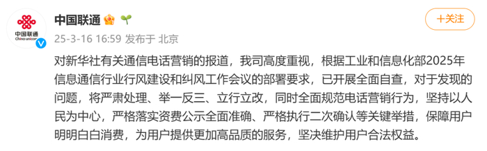 对新华社有关通信电话营销的报道,公司高度重视,根据工业和信息化部2025年信息通信行业行风建设和纠风工作会议的部署要求,已开展全面自查,对于发现的问题,将严肃处理、举一反三、立行立改,同时全面规范电话营销行为,坚持以人民为中心,严格落实资费公示全面准确、严格执行二次确认等关键举措,保障用户明明白白消费,为用户提供更加高品质的服务,坚决维护用户合法权益。