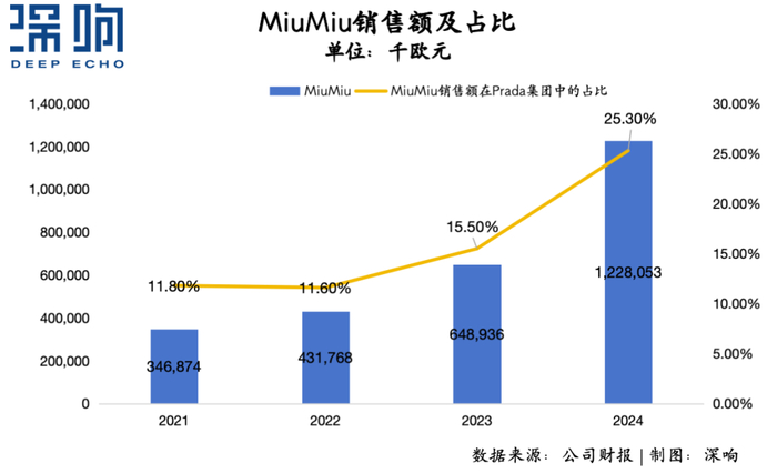 2024年,Miu Miu零售销售额同比暴涨93.2%至12.28亿欧元。拉长时间周期看,Miu Miu仅用三年时间,便将业绩体量从4亿欧元推至“十亿欧元俱乐部”门槛,对集团贡献率也从11.8%跃升到25.3%。