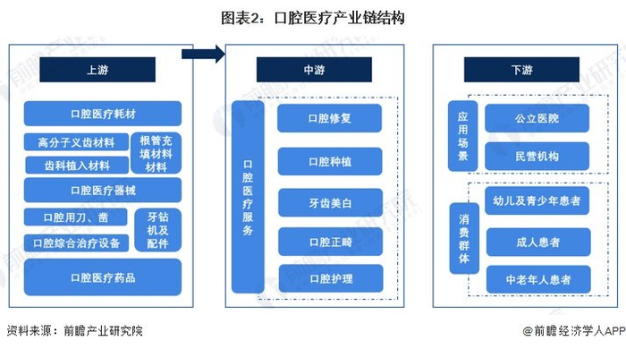 口腔医疗行业是指以口腔医疗消费为基础,集合了口腔医疗服务、职业牙医教育培训、口腔医疗器材研究开发生产、市场策划、宣传、投资、经营、管理等于一体的医疗产业链。口腔医疗行业包括口腔医疗服务和口腔医疗器材行业等。其中,口腔医疗服务主要包括正畸、修复、种植、美白等医疗服务;口腔医疗器材包括义齿加工产品、口腔修复器械、消耗材料;其他细分行业主要包括口腔用药行业和教育培训。