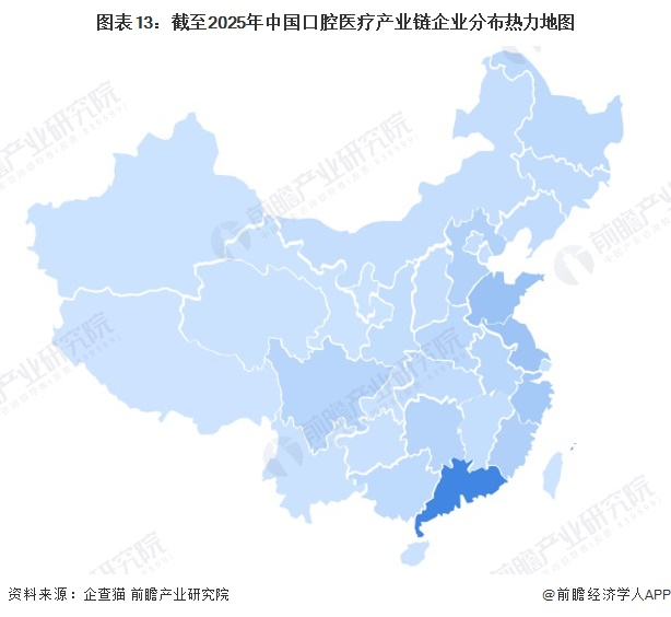 从我国口腔医疗产业链企业区域分布来看,广东、山东、江苏等地区是我国口腔医疗行业分布较为集中的地区,其中,广东分布最为集中。