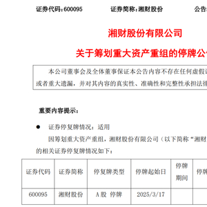 鉴于上述事项存在重大不确定性,为保证公平信息披露,维护投资者利益,避免造成公司股价异常波动,根据上海证券交易所的相关规定,经申请,湘财股份A股股票于3月17日(星期一)开市起停牌,预计停牌时间不超过10个交易日。