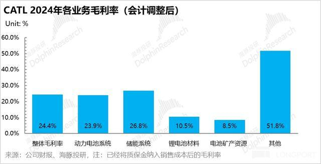 但宁王储能电池的毛利率更高,即使从已经将质保金纳入到销售成本后的调整后的报表来看,储能业务毛利率 2024 年达到了 26.8%,相比动力电池业务 23.9%高了 2.9 个百分点。