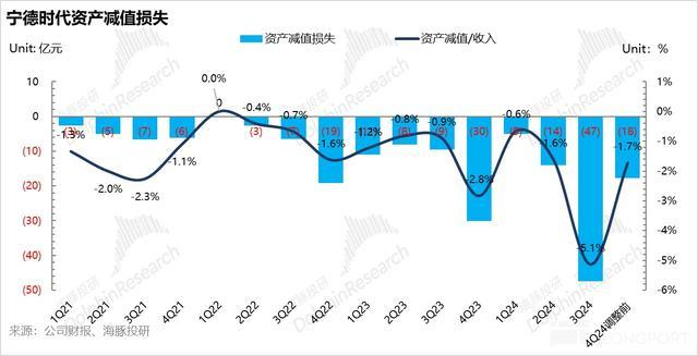 三季度的时候,宁王计提了一笔大额减值损失,约为 47 亿(2.3 亿来自存货跌价准备,45 亿都来自于长期资产减值,而这些长期资产的减值都是与矿产资源的相关资产,换言之,与上游碳酸锂价格直接挂钩的资产)。