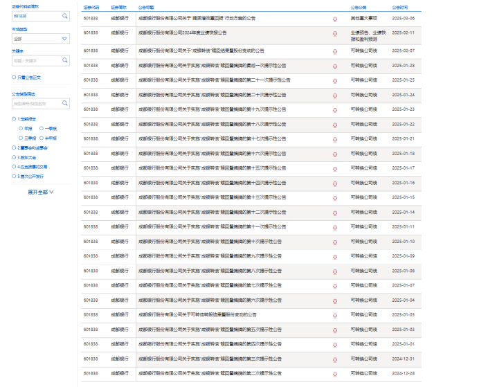 不过作者通过交易所的公告系统,查询了成都银行2024年12月至今的上市公司公告,均未发现有上述收到警示函的公告。