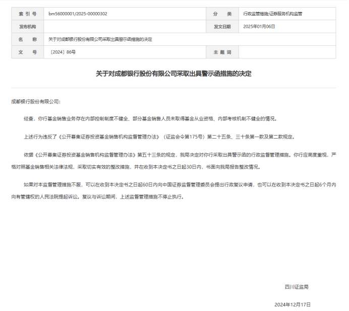 这则警示函的对象是上市公司成都银行。公告内容显示,成都银行因为“基金销售业务存在内部控制制度不健全、部分基金销售人员未取得基金从业资格、内部考核机制不健全的情况。上述行为违反了《公开募集证券投资基金销售机构监督管理办法》(证监会令第175号)第二十五条、三十条第一款及第二款规定。”